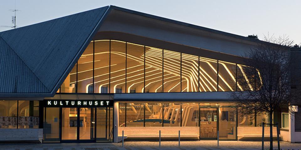 Kulturhuset om kvelden. Da kan du ekstra godt se de spesielle trebjelkene.Kulturhuset og biblioteket